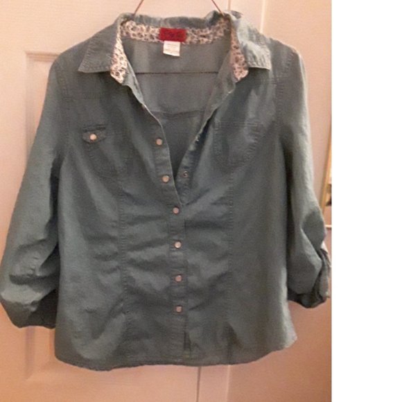 Long sleeved chambray shirt from beyond the rack. Size M but fits more like a small. If large chested a bit tight on the chest if buttoned up and not entirely flattering to the
