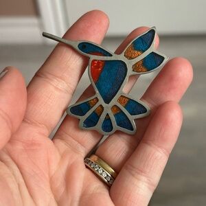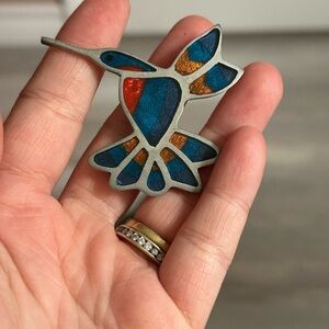 Vibrant hummingbird brooch with blue, orange, and silver accents. Perfect for adding a pop of color to any outfit.