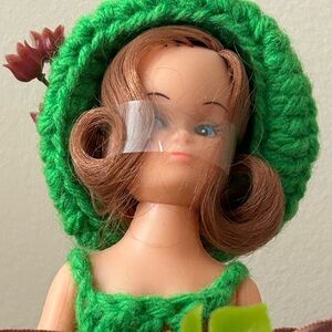 Charming doll cover with a green knitted dress and hat. Features a bouquet of flowers.