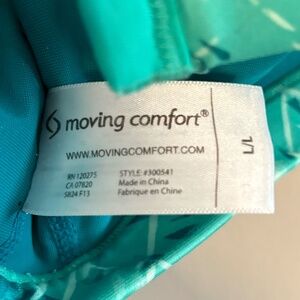Power through your workouts in style with this Moving Comfort teal abstract print racerback sports bra, designed for both support and standout flair. Its breathable fabric and bold pattern keep you cool, confident, and ready to move.