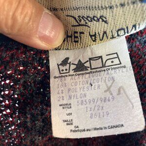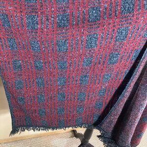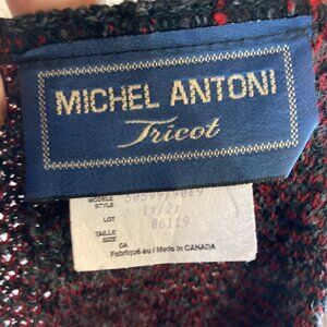 This Michel Antoni Tricot poncho wrap cape, made in Canada, features a bold red and black design with fringe detailing. Long and warm, it's perfect for cooler fall days or as a stylish office wrap. This designer piece combines elegance with comfort.