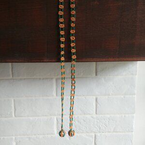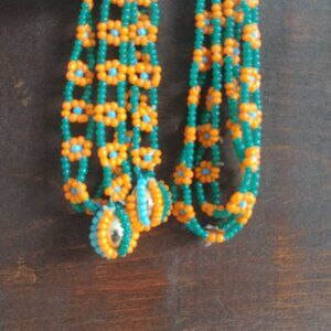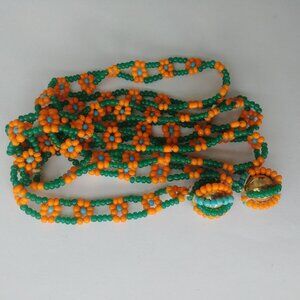 4/$20 Long beaded strand orange flowers green and blue tie necklace