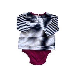 Adorable long-sleeve bodysuit dress by Old Navy for baby girls, size 3-6 months. Features a navy blue and white striped top with a magenta bow on the chest and matching magenta bodysuit bottom. Made of soft 100% cotton for comfort. Snap closures at the bottom and buttons at the back for easy changing.