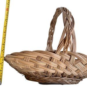 Approximate dimensions (as in in images): Width of basket = 19"; Length to end of handle = 12.5". Width at bottom = 14.5".
