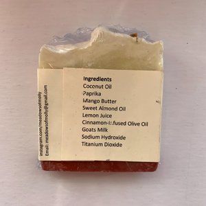 Introducing our exclusive organic soap, carefully crafted with a blend of premium ingredients to pamper and revitalize your skin. Made with only the finest natural ingredients, including coconut oil, paprika, mango butter, sweet almond oil, lemon juice, cinnamon-infused oil, goat's milk, and titanium dioxide, this soap is the perfect choice for anyone seeking a luxurious and refreshing cleansing experience.