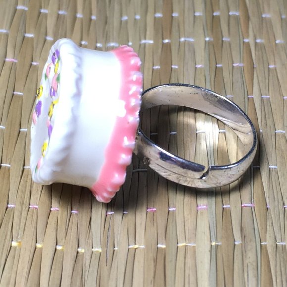 This fun Girls Birthday Cake ring is resin with an adjustable ring in silver tone. It is suitable for ages 8 to adult