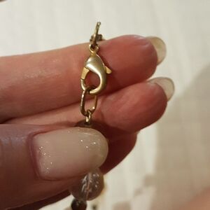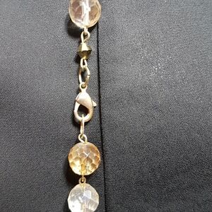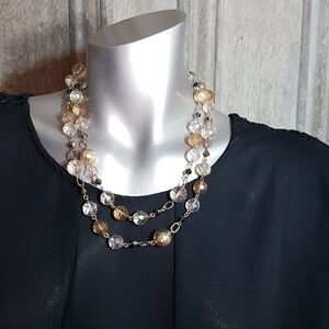 This is such a pretty necklace with gold and black tone beads as well as a few with gold leafing in the center of the bead. There is a tiny bit of tarnishing on the clasp that's barely noticable. Please refer to last two photos.