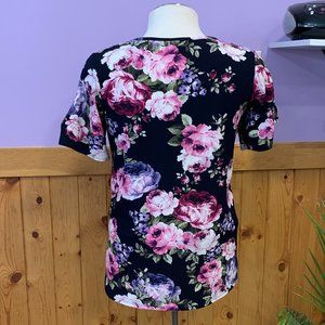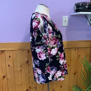 42pops short sleeved cold shoulder floral blouse, size large. Cold shoulder area has ties.