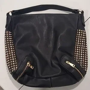 Stunning Black Leather Look with gold zippers and rhinestone detail. functional zippers and slouched look. Great condition.