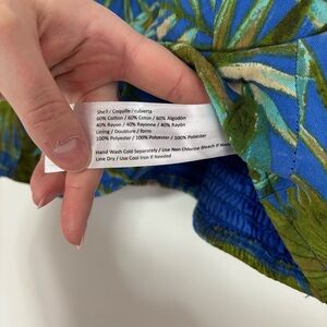 Tropical floral print cropped top with structured cups. Blue and green with palm and flower details. Size Large. Condition: 8/10.