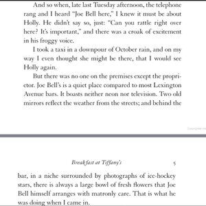 Breakfast at Tiffany's is a novella by Truman Capote published in 1958. In it, a contemporary writer recalls his early days in New York City, when he makes the acquaintance of his remarkable neighbor, Holly Golightly. In 1961 it was adapted into a major motion picture of the same name.