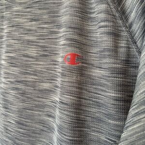 ⚡️ Moisture-wicking athletic tee with subtle grey pattern and red Champion logo. Designed for workouts and training. Excellent shape (8/10).