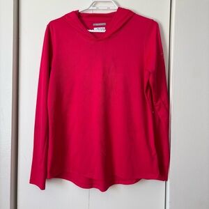 This Columbia long-sleeve top with a hood is lightweight and perfect for layering. Breathable, soft, and ideal for light outdoor activity or casual comfort. Small stain on front.
