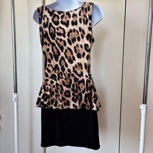 Bold and stylish leopard print peplum top with a solid black skirt bottom. Features a flattering fit-and-flare silhouette that’s perfect for nights out or making a statement during the day.