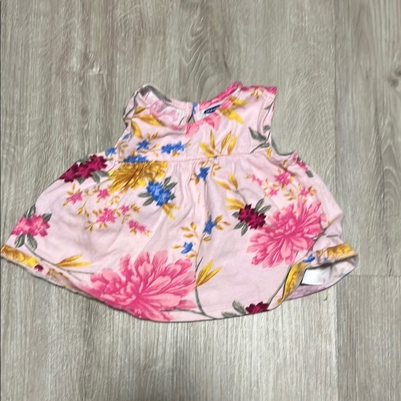Adorable pink baby dress with vibrant floral patterns. Features sleeveless design and a comfortable fit.
