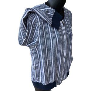 Like new Joe Fresh lightweight fabric blue and white striped longsleeved cropped bomber jacket with zipper closure and pockets.