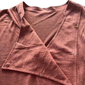 Mandarin collar shirt with button and snap front enclosure with tab cuff short sleeves and wide banded hem in heathered copper colour.