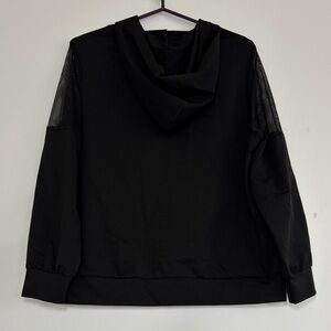 Shein black hoodie with full-zip front and breathable mesh sleeves that add texture and edge. Ideal for layering over gym gear or casual streetwear outfits. The minimalist design allows it to pair well with joggers, leggings, or denim for an effortless athleisure vibe.