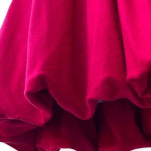 Sleeveless v-neck wrap front dress in blood red colour with lined bubble skirt and red tie satin sash at waist.