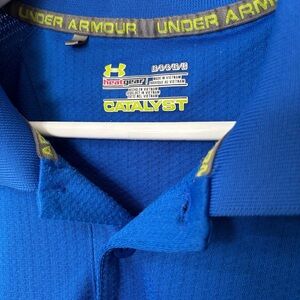 Bright blue athletic polo shirt by Under Armour. Made with lightweight, breathable fabric ideal for sports or casual outings. PTP: 22in | Length: 30in. Condition: 9/10.