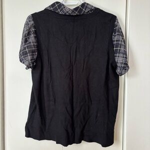 Reitmans vintage short-sleeve button down with built-in black knit vest. Smart and unique layered design. Perfect for officewear or retro style lovers.