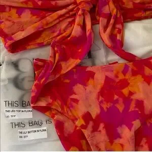 Top is a size Large (I am a 34D and it fits but ideally better for a C!) and bottoms are medium!