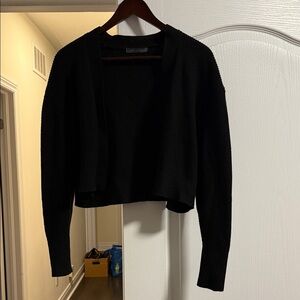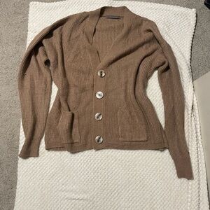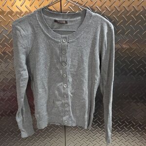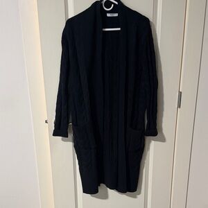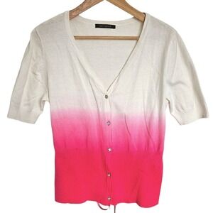Pre-owned Suzy Shier women's cardigan. Off-white, long-sleeved, open-front design. Fabric content: 80% Viscose, 20% Nylon. Features a ribbed texture and a slightly asymmetrical hemline. Hand wash recommended. Care instructions are included on the tag.