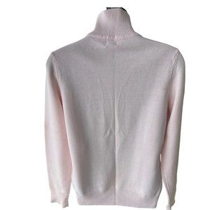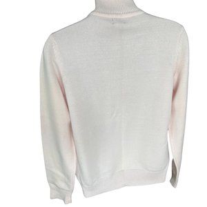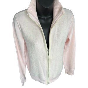 Like new Izod zip cardigan with stand collar in pale pink and cream. The sweater features a faint cream argyle pattern in cream on front, metal zipper placket and rib knit neck, cuffs and hem.