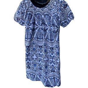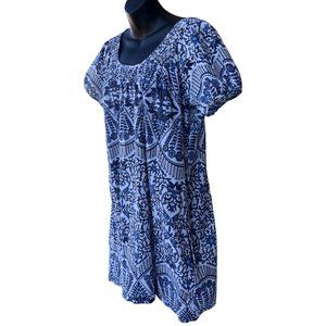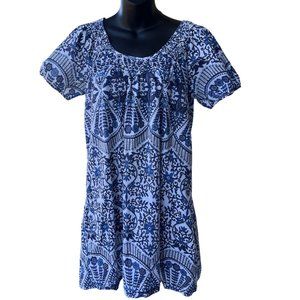 Like new blue and white floral print on A-line mini dress with rounded smocked neck, puffed shorts sleeve and hidden pockets.
