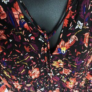 Like new relaxed fit split neck cheery orange/purple on black floral print longsleeve tunic/mini dress features smocked detailing on front. bracelet-length blouson sleeves and peplum back hem.