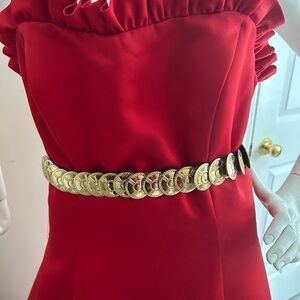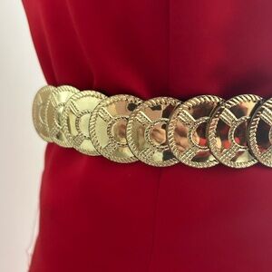Small woman gold medallion belt, stretchy. Can be work under bust or waist, you decide.