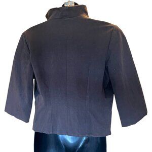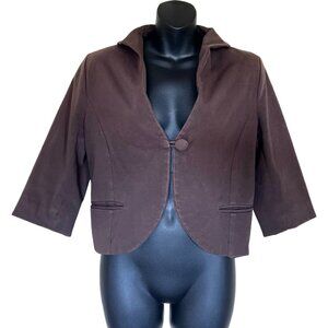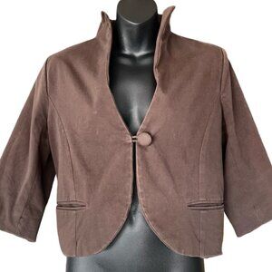 Chic and versatile brown cropped jacket with a structured silhouette and a touch of retro flair. Features a high convertible collar that can be worn folded down or standing up for a sleek, modern look. The single covered button closure at the front adds a minimalist, tailored finish. Excellent used condition.
