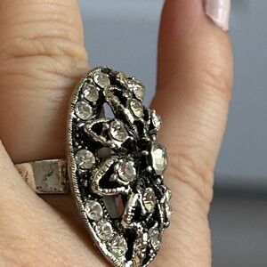 This stunning silver ring features intricate crystal detailing, perfect for adding a touch of elegance to any outfit.