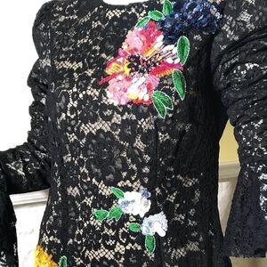 Absolutely fabulous high end designer cocktail dress in beautiful black cotton lace with beige under layer, gorgeous floral sequin beaded embellishments throughout. Flared detail at wrist. Back zip closure. Midi length.