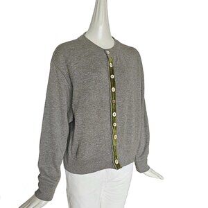 The cardigan features velvet ribbon on front closure with various sizes of buttons.