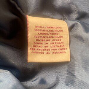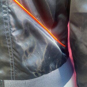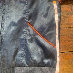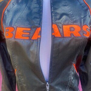 This blue and orange NFL starter jacket is a must have for the Bears fan. Nylon inside and out, double pocket and cotton waste band make this coat comfortable, repellent and stylish. NFL Bears patches on the arms and BEARS across the chest. An NFL original. Makes an excellent gift.