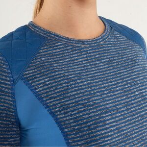 Stylish blue striped long sleeve athletic top. Perfect for workouts.