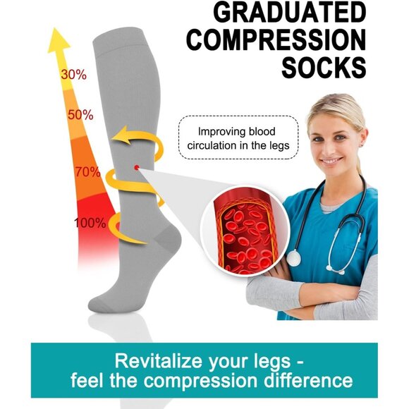 ✔️ENERGIZE YOUR LEGS-- Compression socks have been shown to help decrease swelling and pain in the legs and ankles. Graduated compressions' whole purpose is to increase circulation, thus improving energy levels in the body. Another benefit of improving circulation is decreasing swelling and fluid retention. Increased circulation decreases swelling and increases blood flow, this reduces the feeling of heavy and achy legs.