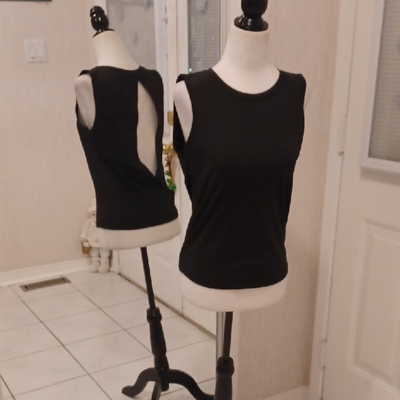 Elegant black sleeveless top with a large open keyhole at the back, crisscrossed fabric, polyester/elastane blend, excellent condition.