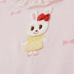 Light pink cotton long-sleeve top from MIKI HOUSE featuring a round neck, long sleeves and an all-over little bows print. There is also a cute bunny patch in front with "my little princess" writing.