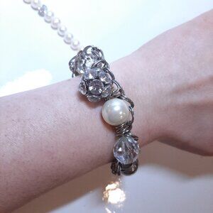 - chunky beaded mix of faux pearl, rhinestone, and metal, linked by a woven chain, on a stretchy band