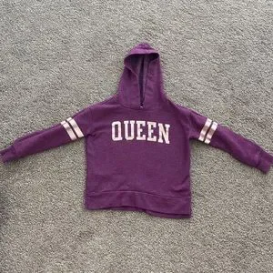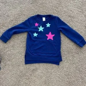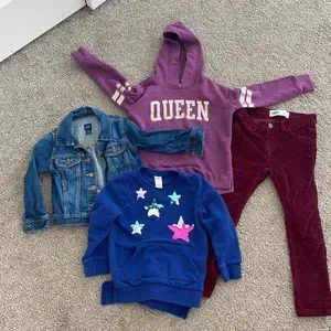 Baby Gap Jean Jacket, OshKosh sweater with sequence stars, The Children’s Place “Queen” hoodie, and Old Navy velvet ballerina pants. Everything is 4T except the pants are 5T