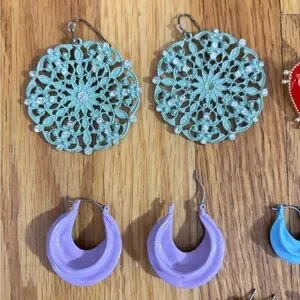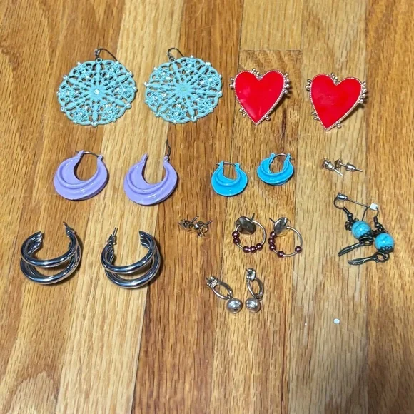 Set of vibrant earrings in various shapes and colors. Includes red heart, blue floral, purple crescent, and more. 10 pairs of earrings in very good condition.