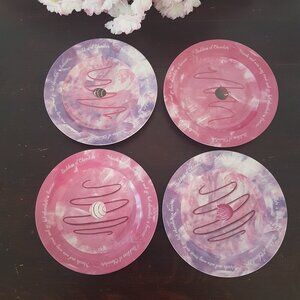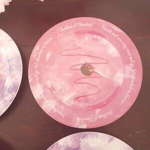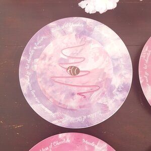 Vintage Goddess of Chocolate 4 piece ceramic dessert plates in original round box. Plates in pink and purple, with a different chocolate candy on each plate. In script around the rim "Moods and men may come and go, but chocolate is forever - Chocolate Goddess"