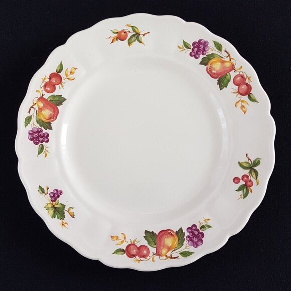 Mid-Century Grindley (England) Evesham small dinner plate or luncheon plates. Evesham is a multi-colored fruit pattern of apples, pears, grapes and red berries on a creamy white. Made in England, circa 1950s