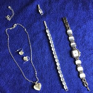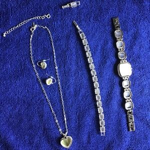 4-piece set consisting of a tennis bracelet and a bracelet watch both adorned with translucent white stones, a silver chain necklace with a heart-shaped pendant, and a pair of matching hook earrings. The watch needs a battery replacement, stainless steel back and quartz Japanese movement. In good condition.