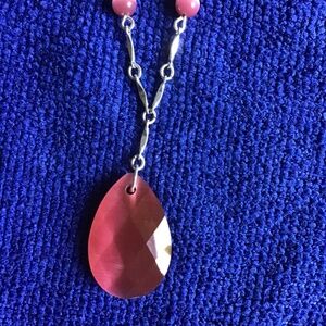 4-piece set consisting of an elegant tennis bracelet, a necklace, and two pairs of earrings—pink and silver. Pink pendant and beads on a silver tone chain and two pairs of matching earrings.