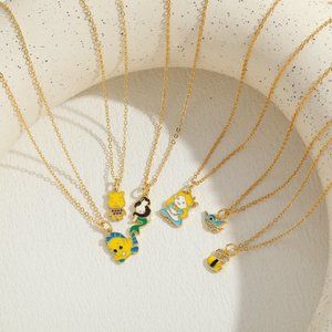 This adorable gold-tone necklace features a delightful bear-shaped pendant with a bright yellow finish. The bear's tiny shirt is embellished with sparkling pink stones, adding a touch of whimsy and charm. The delicate chain complements the playful design, making it a perfect accessory for both casual and dressy occasions. Ideal for adding a fun flair to any outfit, this necklace is a great gift option for those who love unique jewelry pieces.