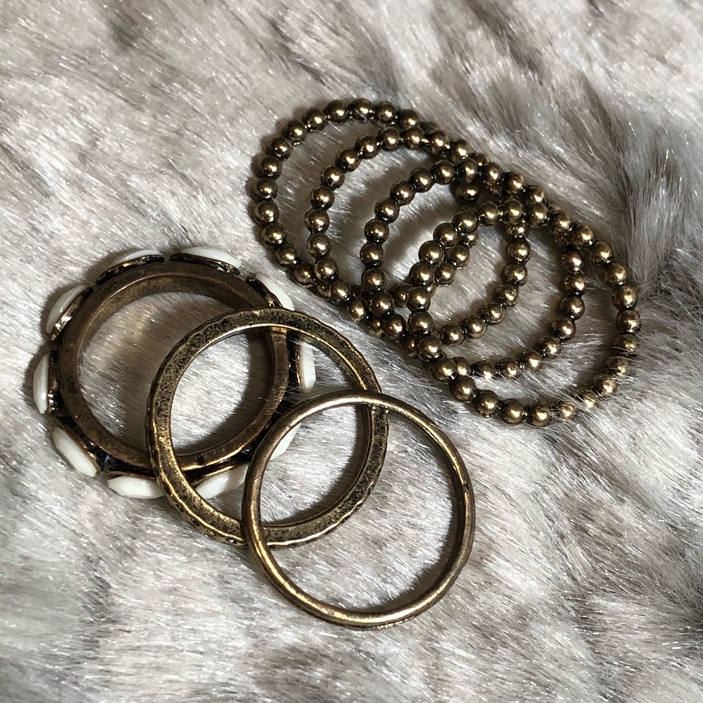 Stylish stackable gold ring set of 7 from Aldo. All gold rings are size 7, white & gold ring is size 6. Unlimited ways to wear! β¨