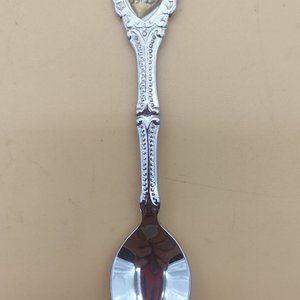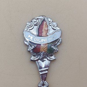 5 collectors' spoons from different parts of Alberta, Canada: an Edmonton spoon topped with oil rigs, a Calgary Tower spoon, one for Calgary Zoo topped with a dinosaur, Medicine Hat with a maple leaf and 3 Hills topped with the town coat of arms. For reference the Medicine Hat spoon is 4 5/8" long.